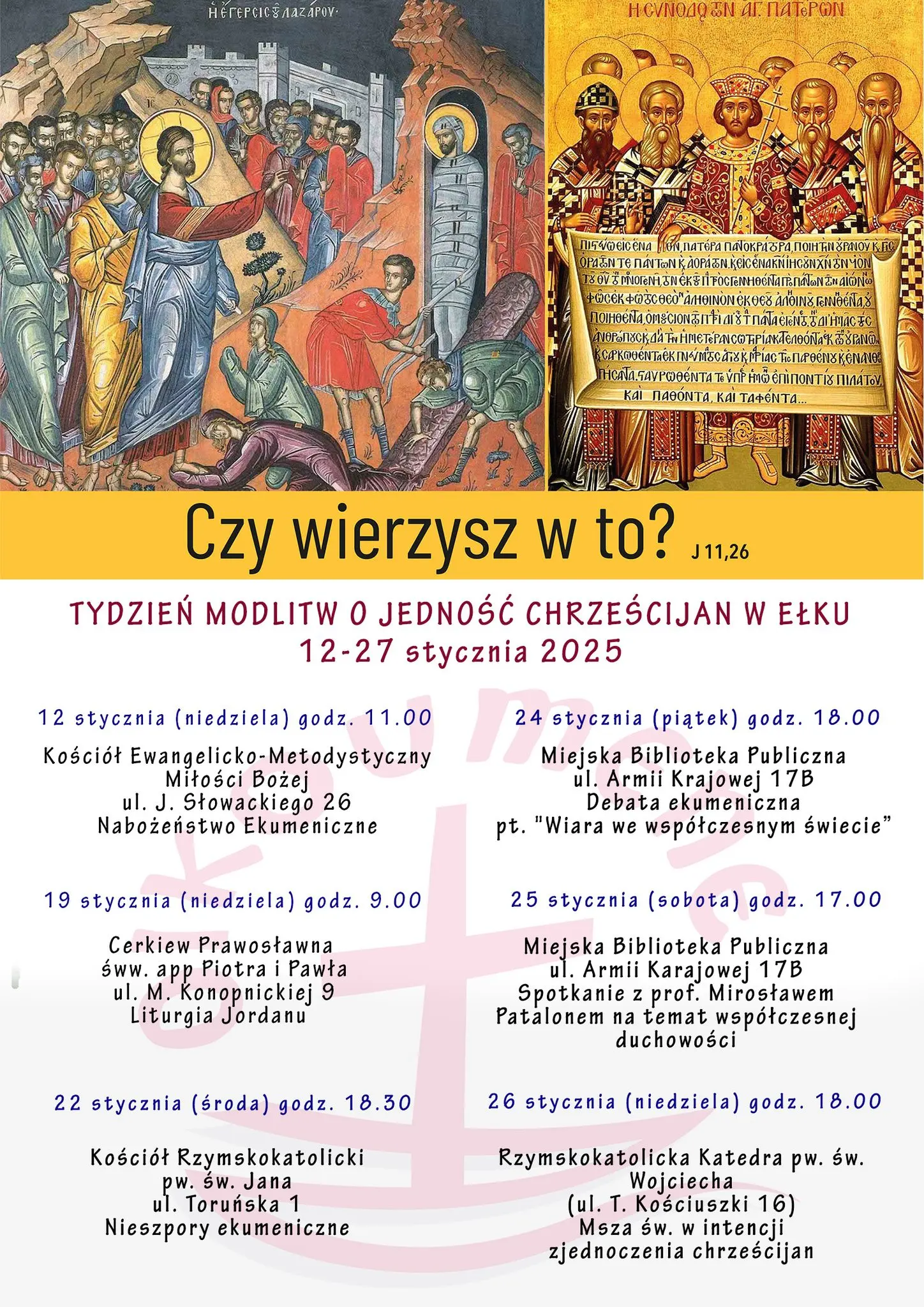 Tydzień Modlitw o Jedność Chrześcijan ma ponad stuletnią tradycję. Co roku, na całym świecie, chrześcijanie różnych wyznań spotykają się na wspólnych nabożeństwach, konferencjach, wykładach, spotkaniach czy koncertach. Zwyczajowo towarzyszy temu hasło przewodnie. W 2025 roku są to słowa Jezusa: „Wierzysz w to?” (J 11, 26). W kościołach trwają już przygotowania do tego czasu, ale nie tylko w nich – w obchody równie chętnie włączają się świeckie organizacje i instytucje kulturalne. W samym Ełku doroczne święto ekumenizmu rozpoczęło się nieco wcześniej – 12 stycznia i potrwa do 26 stycznia włącznie.